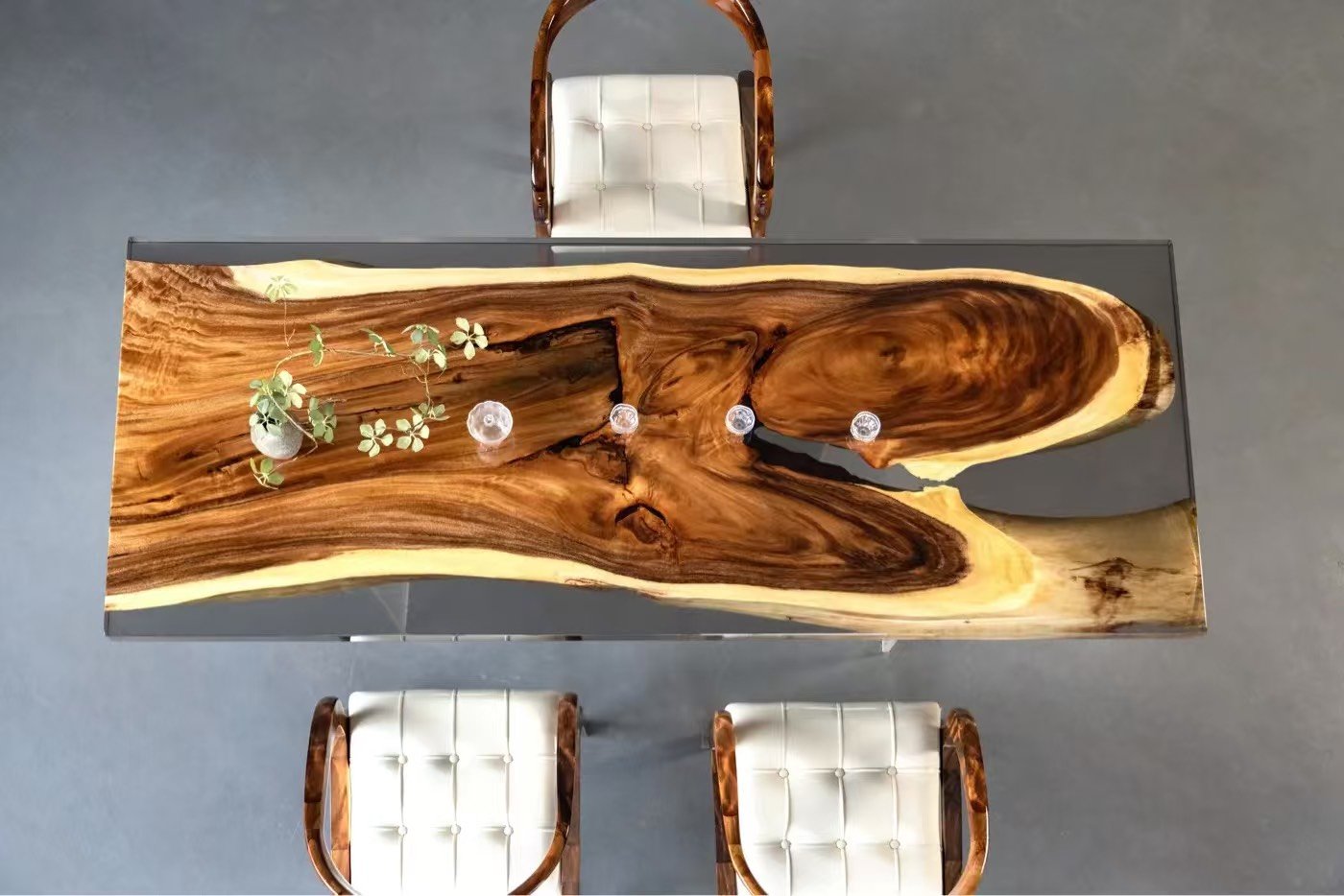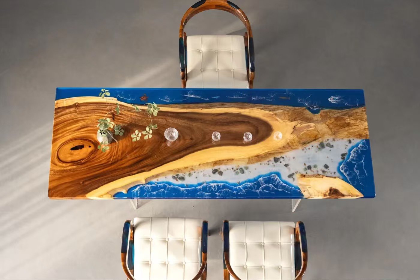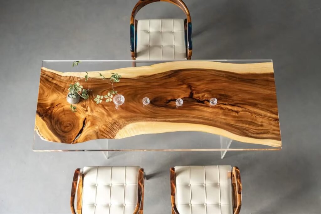 Handmade river tables blending natural timber with stunning resin art.